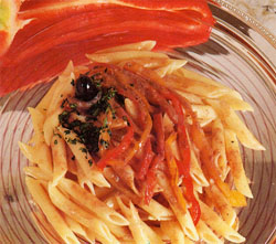 Passer l'ail et les anchois égouttés dans un broyeur ou au robot culinaire. Chauffer l'huile dans une grande casserole et ajouter le mélange ail/anchois et cuire à  feu doux jusqu'à  tendreté. Ajouter les minces tranches de poivron et bien humecter. Assaisonner légèrement et ajouter le vin le laissant s'évaporer lentement. Ajouter ensuite la pâte de tomates diluée avec le bouillon chaud.