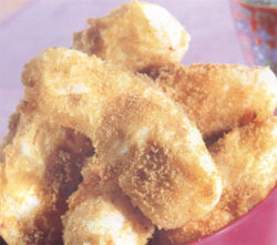 Chauffer l'huile dans un wok déjà  réchauffé jusqu'à  ce que l'huile fume, réduire le feu légèrement. Un à  un, à  l'aide d'une fourchette, enrober les morceaux de banane et égoutter l'excédent de pâte.