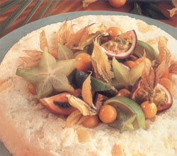fruits tropicaux assortis, comme fruit de la passion, ananas, papaye, mangue ou carambole pour servir