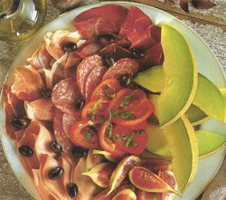 Étendre le melon et les figues sur le reste du plat et disperser les olives sur les viandes. Servir avec un soupçon d'huile d'olive pour arroser le bresaola et poivrer.