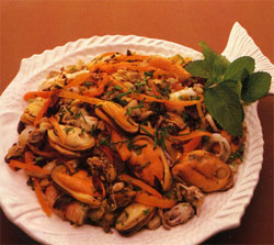 Nettoyer les moules et les faire cuire à  la vapeur à  feu modéré dans une grande casserole à  couvert plusieurs minutes jusqu'à  ce qu'elles s'ouvrent. Jeter celles qui resteront fermées. Retirer les moules de leur coquille.