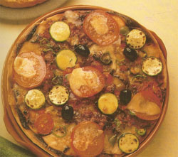 Rincer et égoutter les anchois et les câpres. Couvrir les rondelles de pâte avec les tomates et y étaler les anchois, les câpres et les olives. Ajouter les courgettes et les tomates fraîches. Saler légèrement et mettre un peu d'huile d'olive. Couvrir de fromage mozzarella