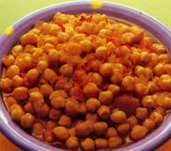 A feu moyen, chauffer l'huile dans une casserole. Ajouter l'oignon et cuire jusqu'à  ce qu'il devienne transparent mais sans le laisser brunir. Ajouter les pois chiches et ensuite les tomates et les flocons de piment ou le piment fort haché. Goà »ter avant d'ajouter du sel, ajouter le poivre et le liquide réservé des pois chiches. Amener à  ébullition et mijoter 5 minutes. Dissoudre le safran dans un peu d'eau et ajouter à  la casserole. Bien mélanger et cuire 1 à  2 minutes. Transférer dans un bol et servir.