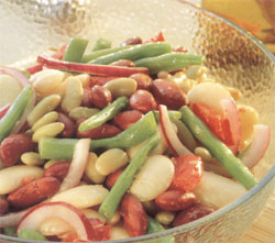 PRéPARATION: Mettre les légumineuses dans un grand bol. Ajouter l'oignon tranché et bien mélanger. Couper les haricots verts en deux et cuire à  l'eau bouillante légèrement salée environ 8 minutes ou jusqu'à  tendreté. Rafraichir à  l'eau froide et bien égoutter. Les ajouter aux légumineuses et incorporer les poivrons.