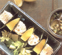 Égoutter le poisson, réserver tout le liquide et enfiler sur des brochettes de bambou en alternant avec feuilles de laurier et quartier de citron.